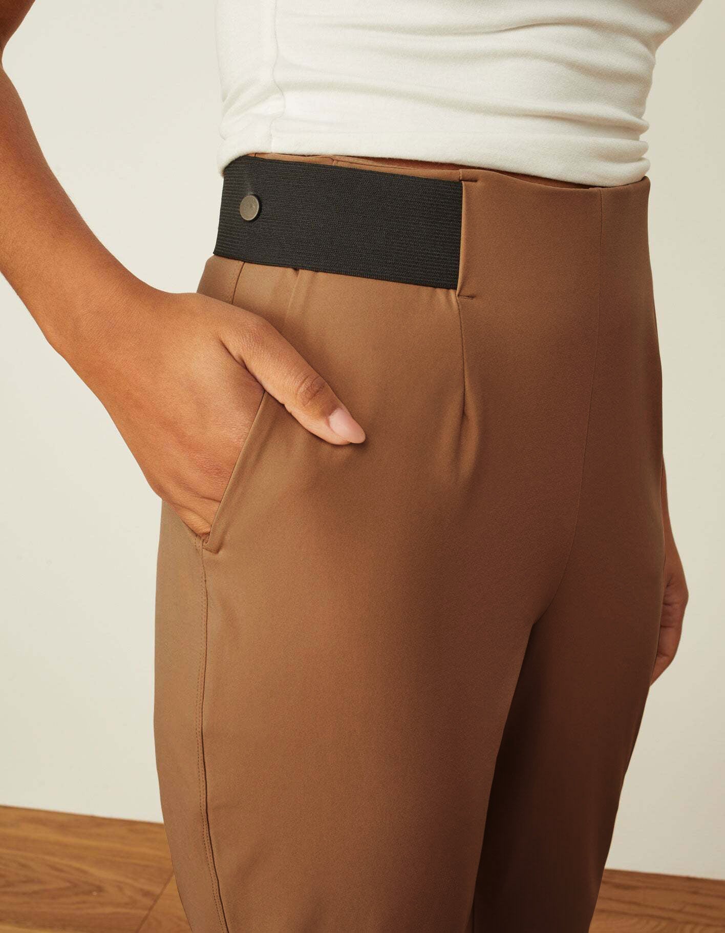 Back by popular demand. Our Turn It Around is the sister style to the best-selling Turn It Up pants. These tapered, straight leg pants feature the same stretch + exposed elastic detailing you know and love, but without the front pleating.
